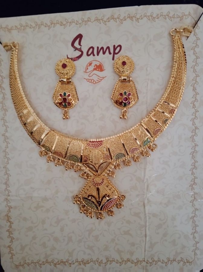 Yeh beautiful traditional necklace set gold plated finish ke saath design kiya gaya hai jisme colorful stones aur detailed craftsmanship diya gaya hai. Is set ke saath matching stylish earrings bhi aate hain jo poore look ko aur bhi attractive aur royal bana dete hain.