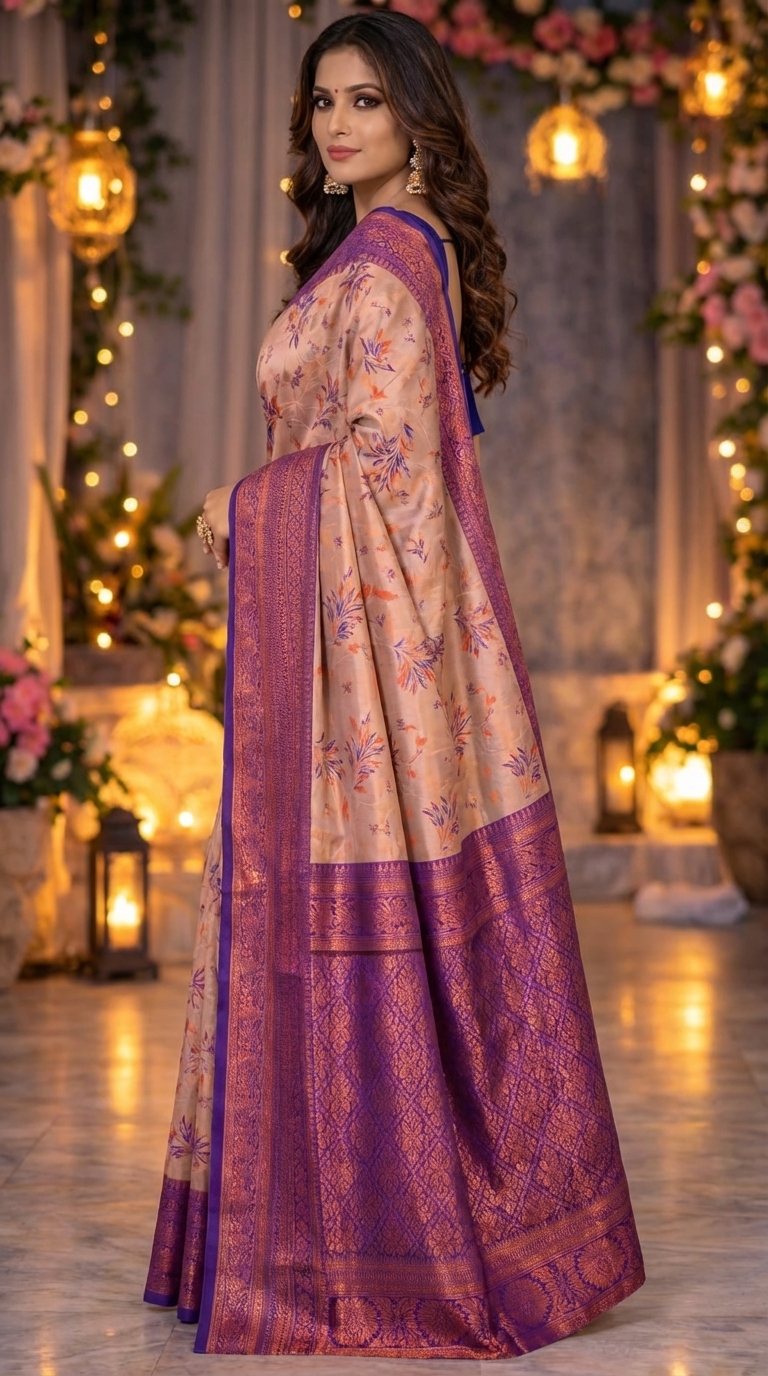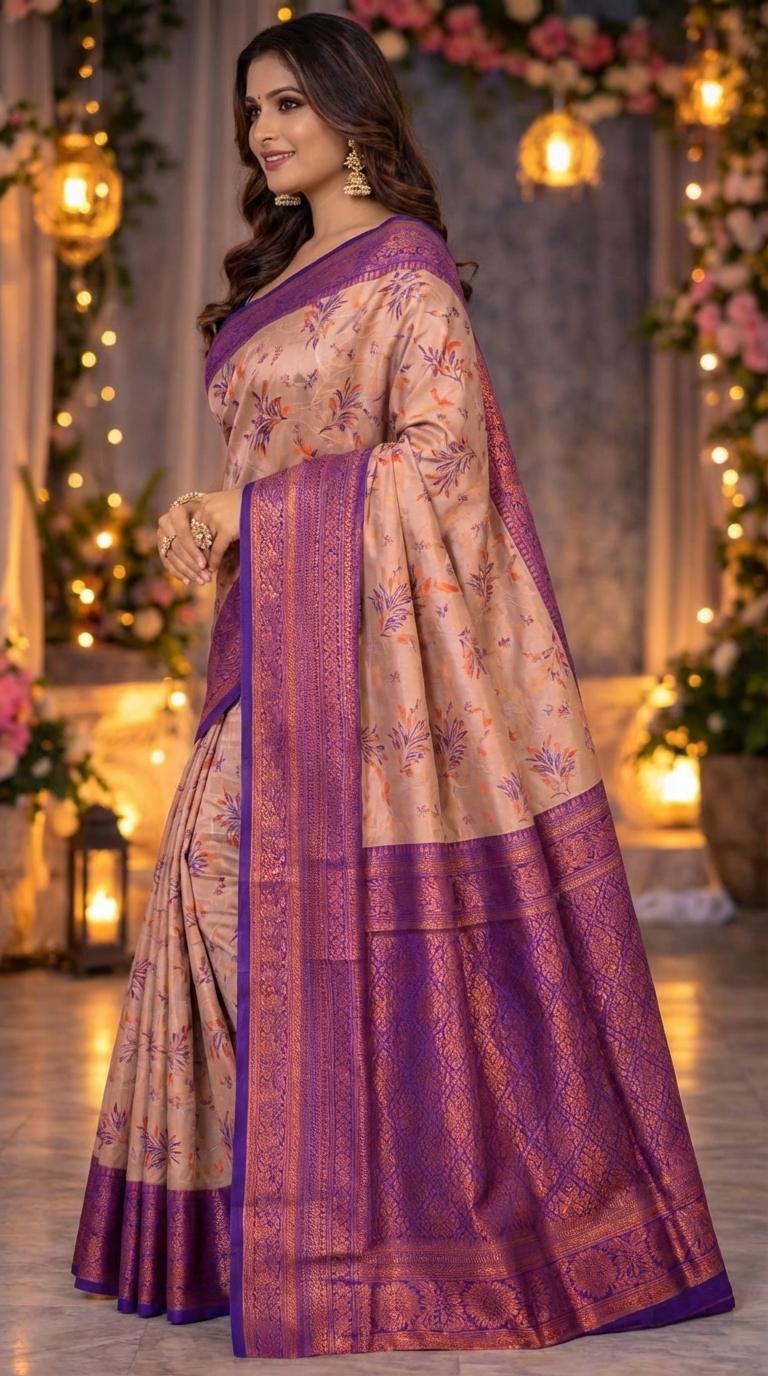 Is saree ka purple zari border aur pallu iske overall look ko aur bhi premium aur festive banata hai. Beige base color ke saath purple detailing ka combination saree ko elegant aur eye-catching appearance deta hai.
