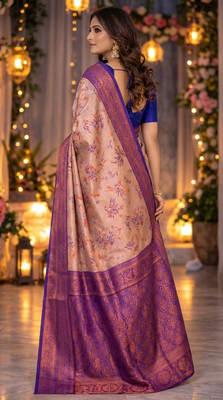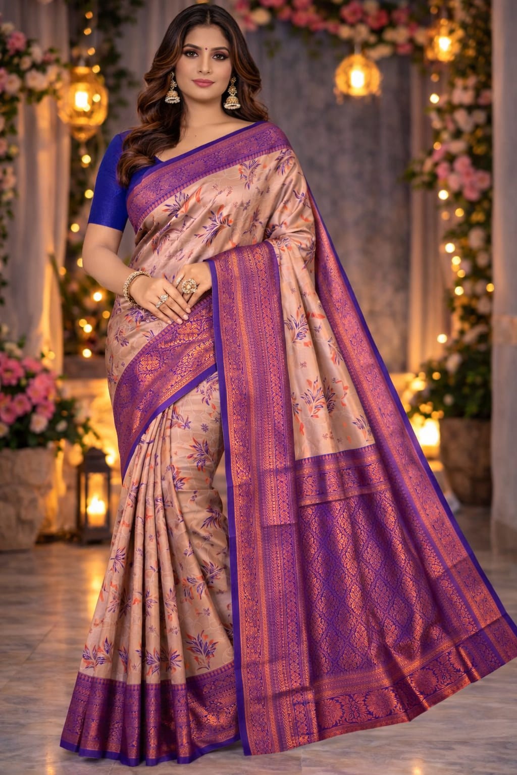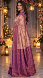 Yeh women’s beige aur purple traditional saree graceful aur elegant design ke saath banayi gayi hai jo aapko ek royal aur classy look deti hai. Saree par delicate floral motifs aur rich woven pattern diya gaya hai jo traditional Indian craftsmanship ko beautifully showcase karta hai.