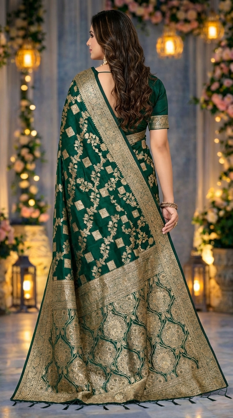 Women’s Dark Green Banarasi Style Silk Saree with Rich Zari Work
