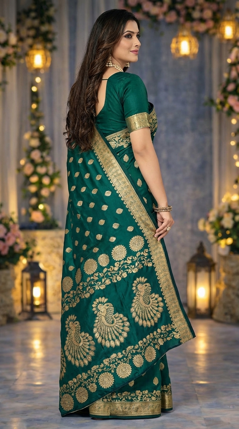 Women’s Dark Green Banarasi Style Silk Saree with Rich Zari Work
