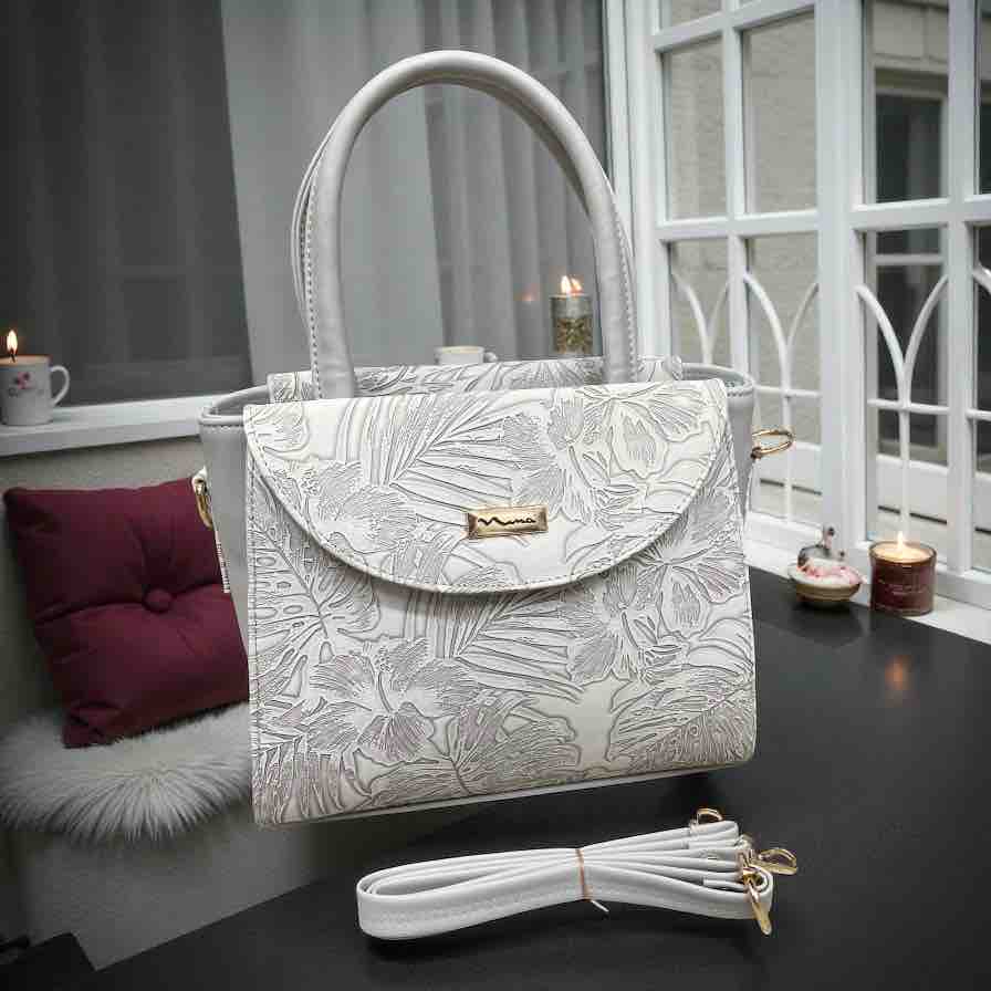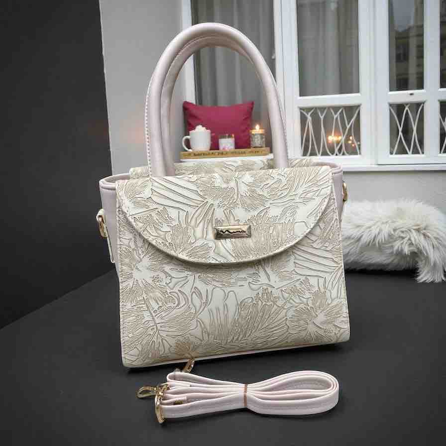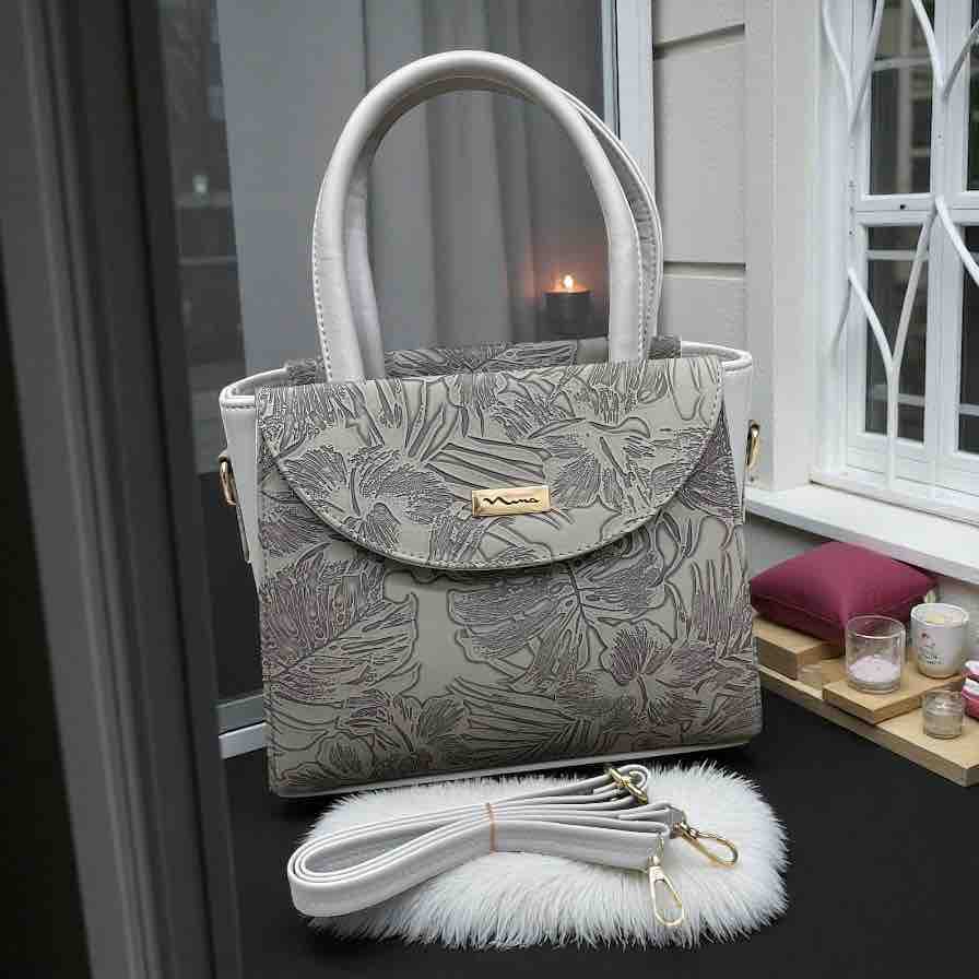 Premium embossed handbag with stylish design, multiple color options and detachable sling strap.