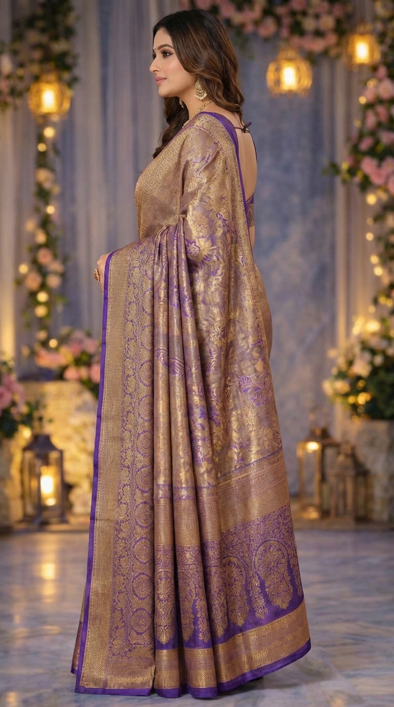 Is saree par intricate zari weaving aur beautiful traditional motifs diye gaye hain jo saree ko elegant aur rich look dete hain. Iska stunning purple contrast border aur beautifully designed pallu saree ke overall design ko aur bhi royal aur eye-catching banata hai. 🌸