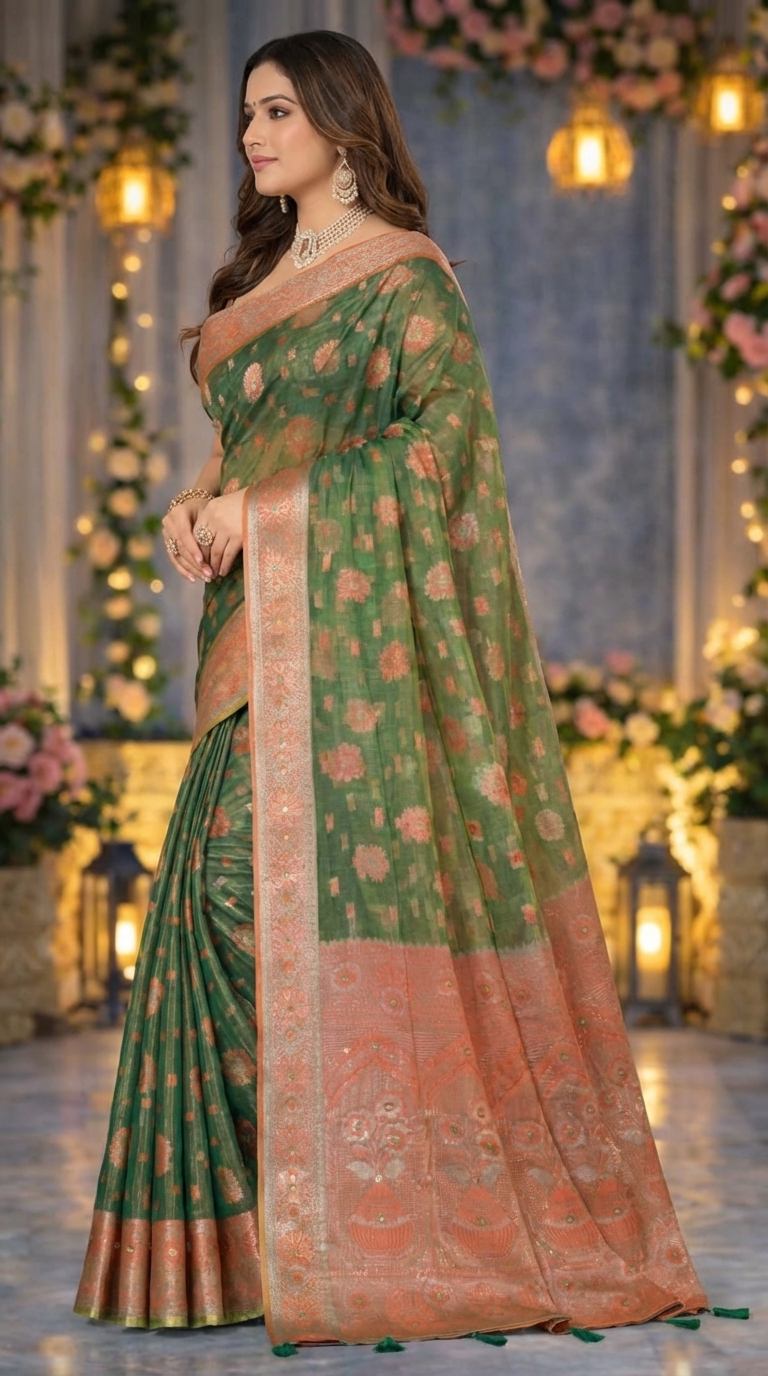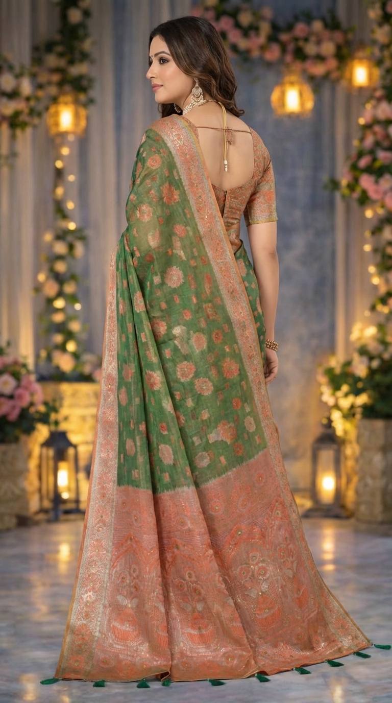 Is saree ka peach zari border aur beautifully designed pallu iske overall appearance ko aur bhi rich aur festive banata hai. Green aur peach color combination saree ko fresh aur elegant look deta hai jo special occasions ke liye perfect hai.