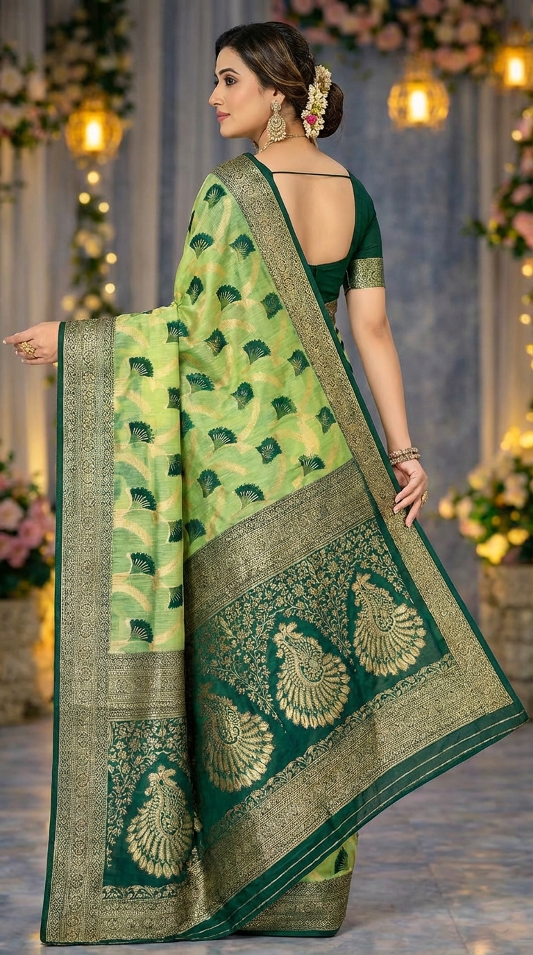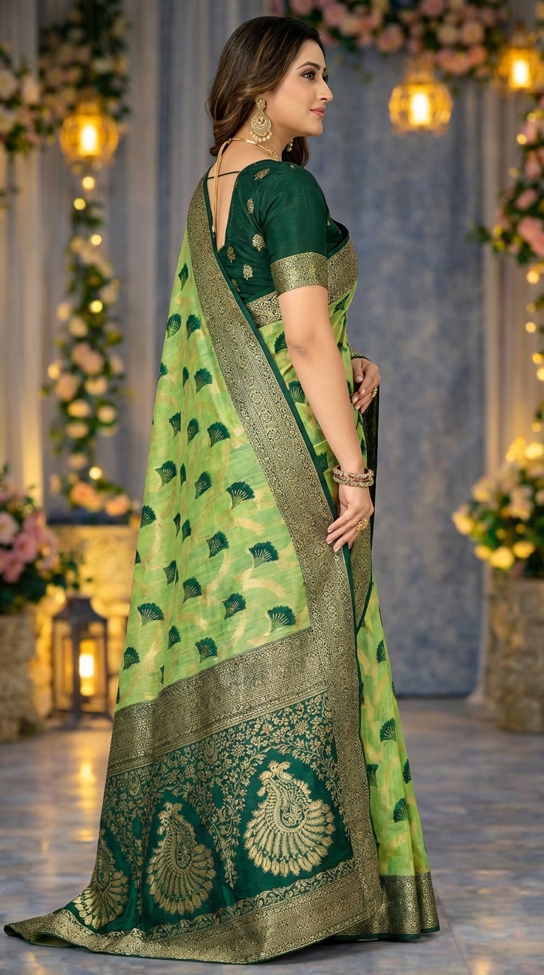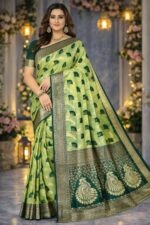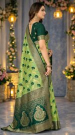 Is saree ka rich dark green zari border aur detailed pallu design ise aur bhi royal aur luxurious appearance deta hai. Light green aur dark green color combination saree ko fresh aur attractive look deta hai jo festive occasions ke liye perfect hai.