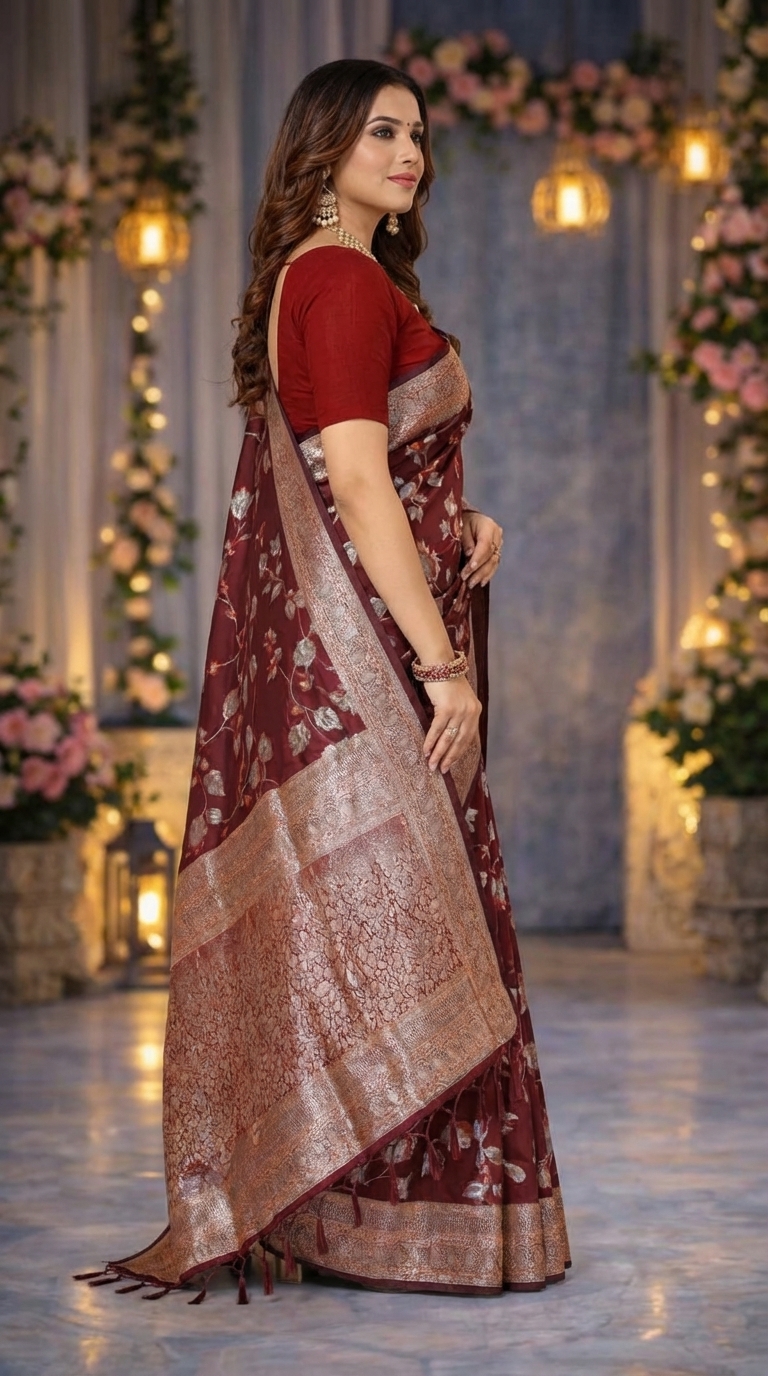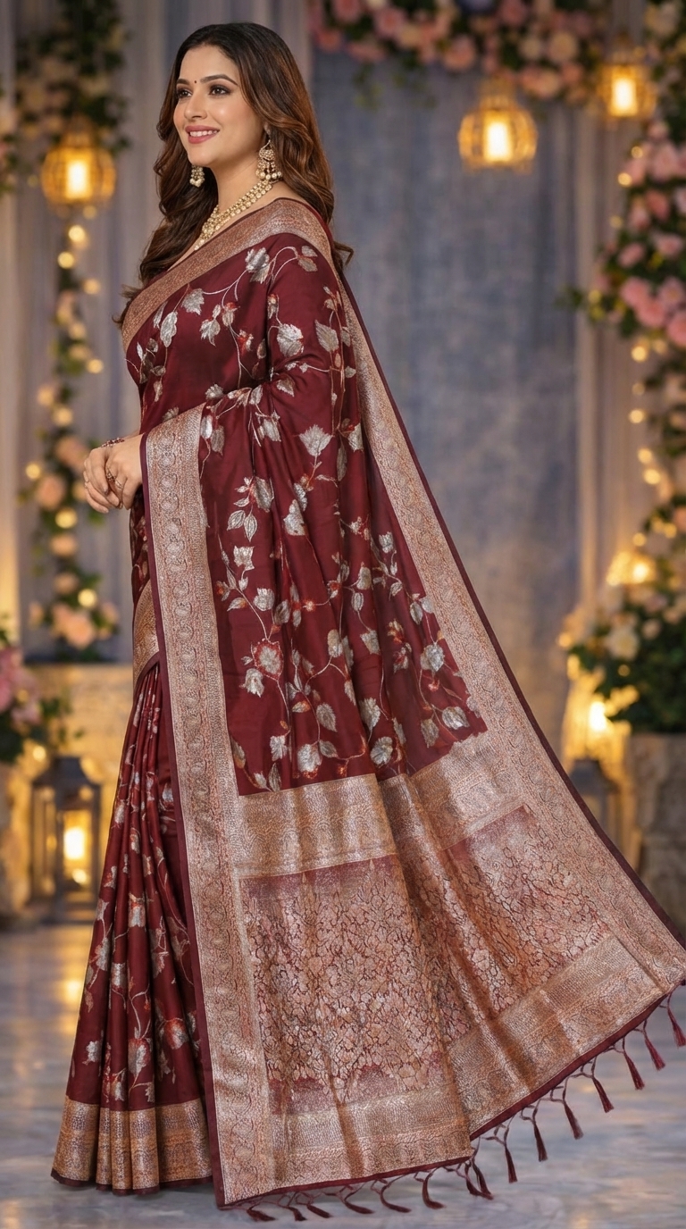 Women’s Maroon Banarasi Style Silk Saree with Floral Zari Design