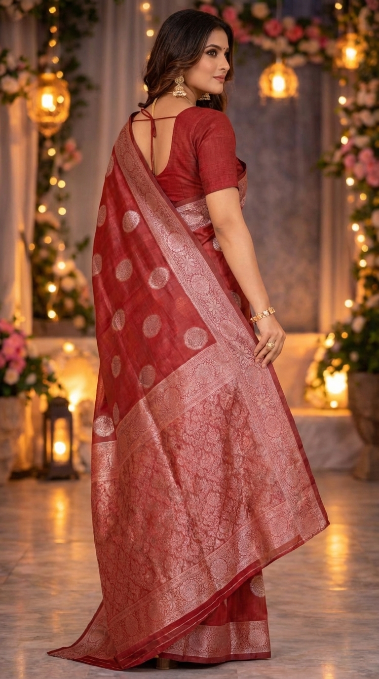 Yeh women’s maroon silk saree silver zari motifs aur elegant traditional border ke saath classy ethnic look deti hai. Wedding aur festive occasions ke liye perfect choice hai. ❤️