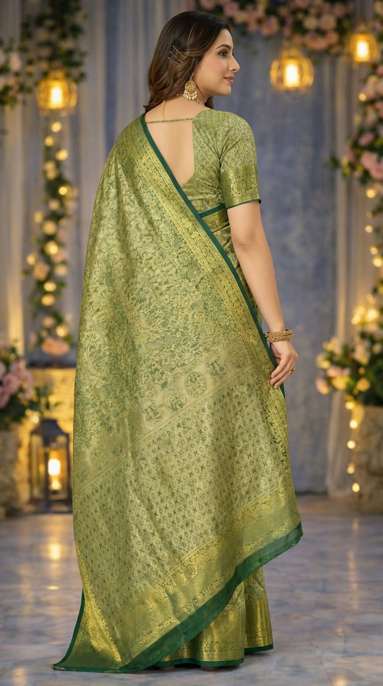 Women’s Olive Green Silk Saree with Gold Zari Design – Elegant Traditional Festive Wear