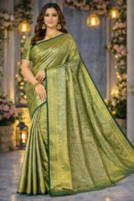 Yeh women’s olive green silk saree gold zari weaving aur rich traditional border ke saath royal ethnic look deti hai. Wedding aur festive occasions ke liye perfect choice hai. 💚