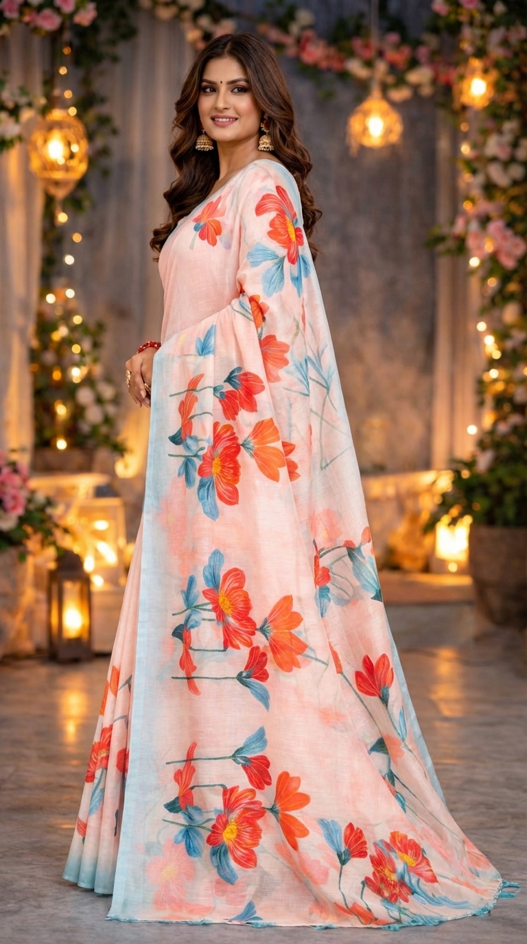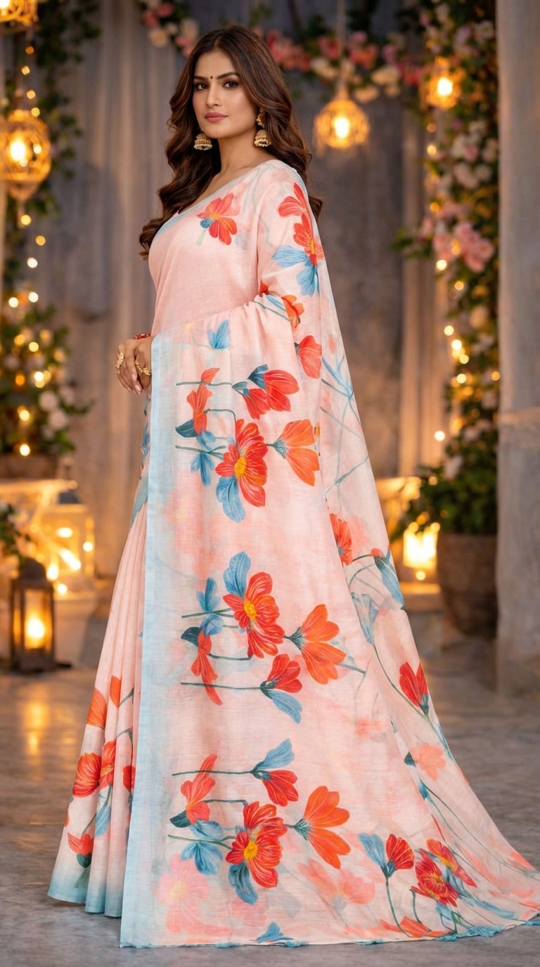 Yeh women’s peach floral printed saree soft pastel colors aur beautiful flower design ke saath fresh aur stylish ethnic look deti hai. Parties aur festive occasions ke liye perfect choice hai. 🌸