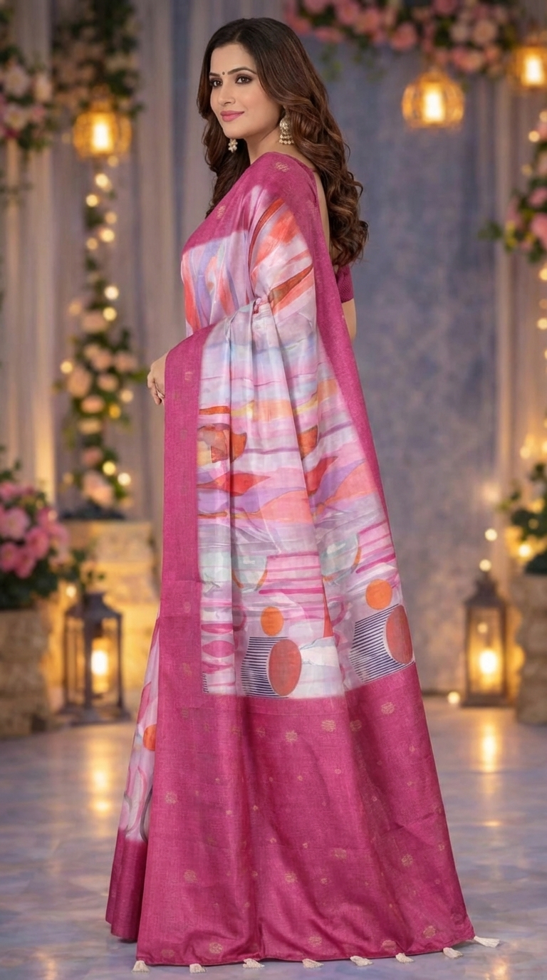 Women’s Pink Printed Silk Saree with Designer Pallu – Elegant Festive Wear