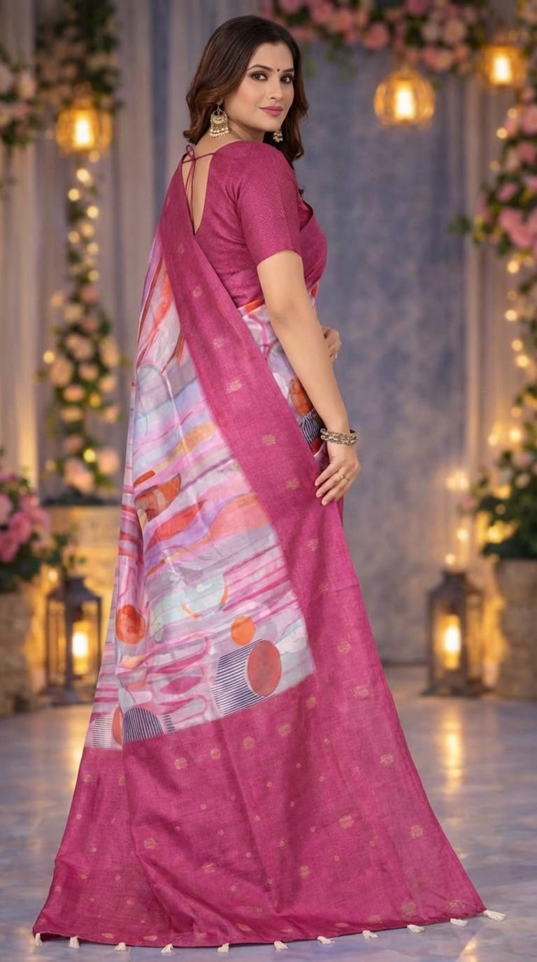 Yeh women’s pink printed saree modern pattern aur elegant design ke saath stylish ethnic look deti hai. Festivals aur parties ke liye perfect choice hai. 💖