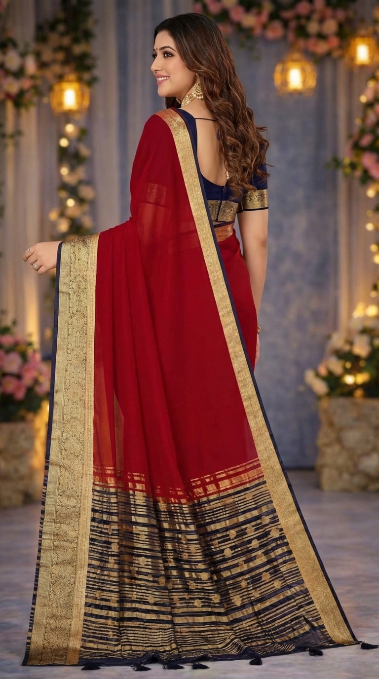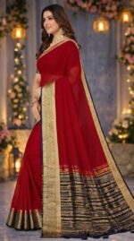 Yeh women’s red saree gold zari border aur classic traditional design ke saath elegant festive look deti hai. Wedding aur special occasions ke liye perfect choice hai. ❤️