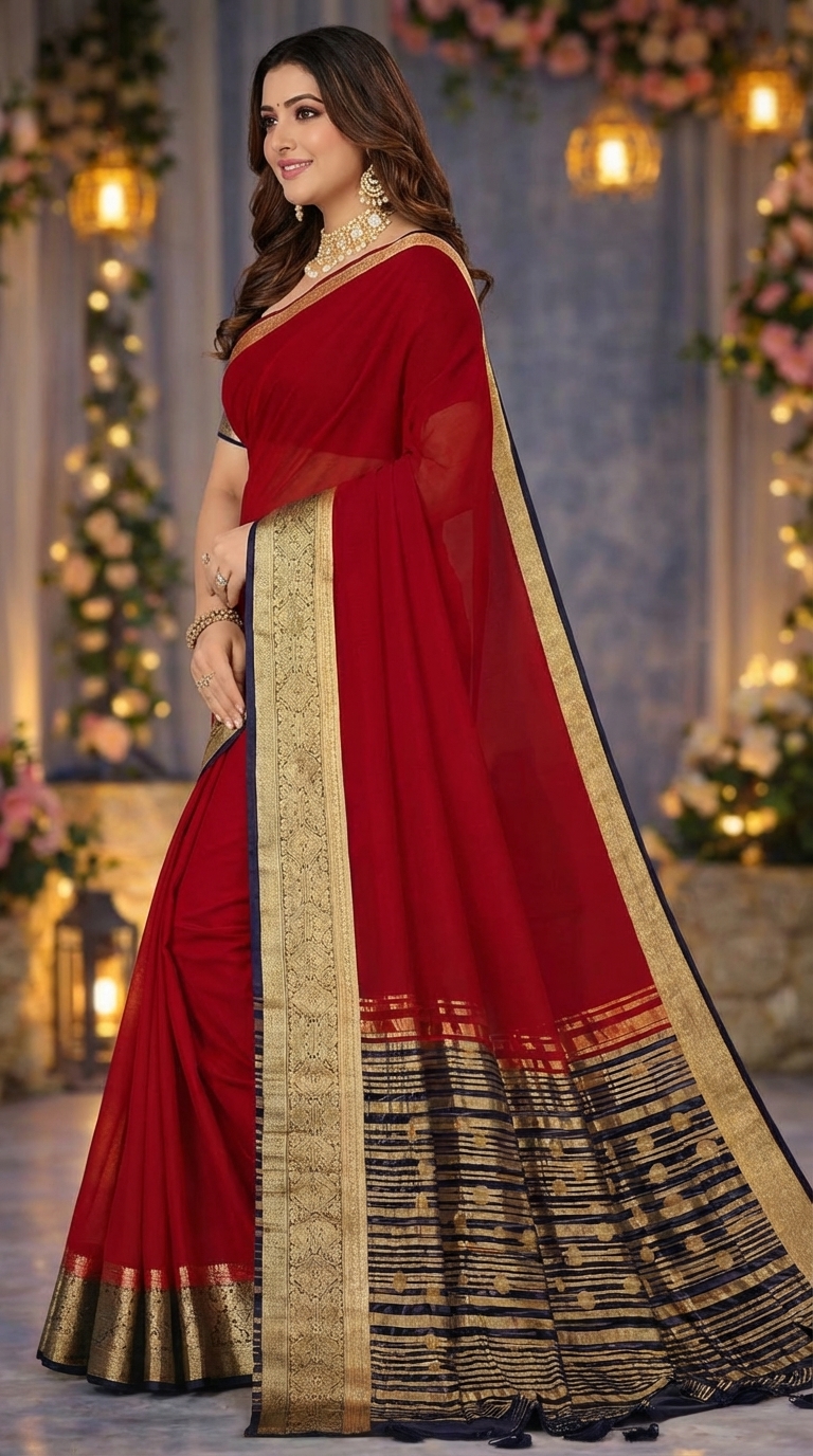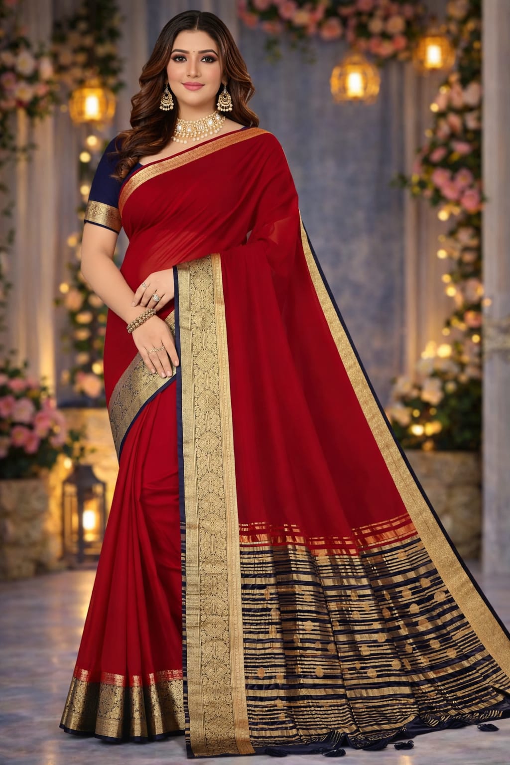Women’s Red Silk Saree with Gold Zari Border – Elegant Traditional Festive Wear