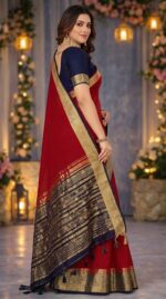 Women’s Red Silk Saree with Royal Blue Zari Border – Elegant Traditional Festive Wear