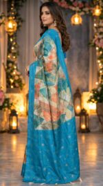 Yeh women’s sky blue printed saree modern geometric design aur elegant style ke saath stylish ethnic look deti hai. Festivals aur parties ke liye perfect choice hai. 💙