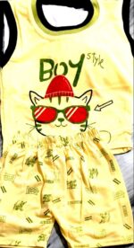 Ye stylish yellow summer set chhote bachcho ke liye perfect daily wear outfit hai. Isme sleeveless printed t-shirt aur matching shorts milte hain jo bachche ko cool aur comfortable look dete hain.